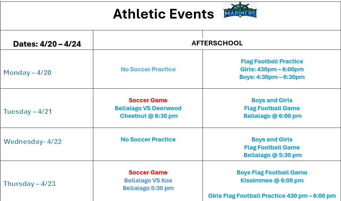 Attached is the athletic calendar for this week. Today’s game is at Kissimmee Middle School, and transportation will be provided.